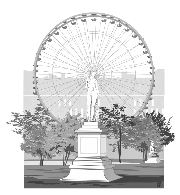 Rivoli et Tuileries : l’une des plus belles rues à arcades de Paris rivalise avec l’un des plus beaux jardins à la française de Paris. Un ancien décret interdisait aux propriétaires de la première, l’installation de pancartes, écriteaux et enseignes, ainsi que toute nuisance sonore ou malodorante, tandis que le second y possédait sa Salle du Manège Royal des Tuileries. De 1985 au début des années 2000, la grande roue de la Concorde y sema la discorde, en faisant le paon derrière une Diane impassible et sous les fenêtres des riverains ! – 2003©IdR – Diane au Jardin des Tuileries.