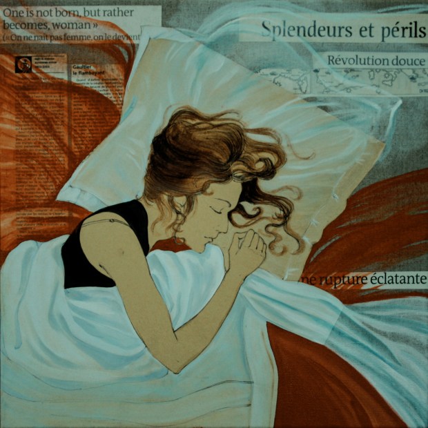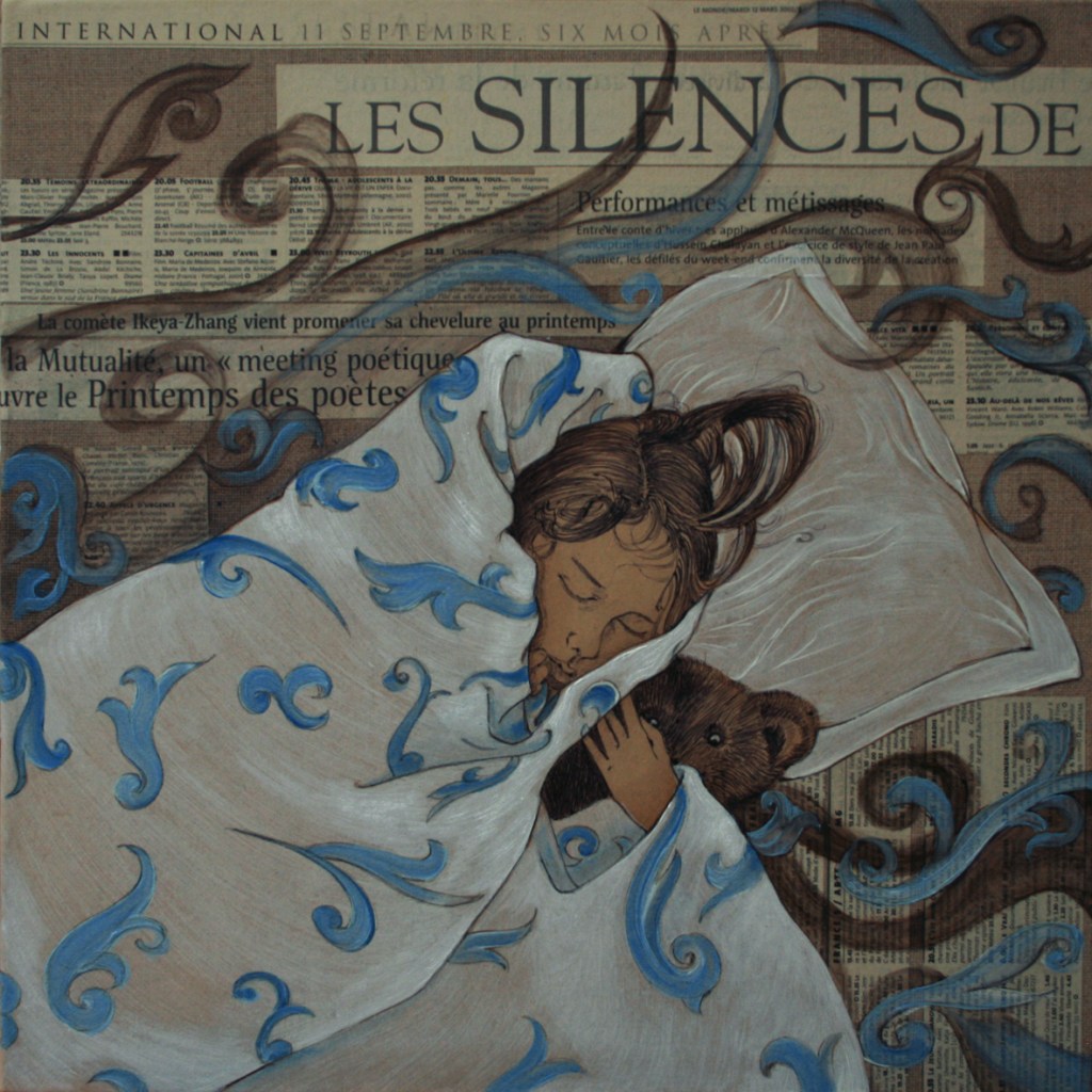 Palims(i)este – Huile sur toile de lin – 60 x 120 cm – Coll.privéeBruits et chuchotements – Huile sur toile de lin – 60 x 120 cm – Coll.privéeCarpe Diem – Huile sur toile de lin – 60 x 120 cm – Coll.privéeBaby blues – Autoportrait – Huile sur toile de lin – 60 x 120 cm – Coll.privéeLe deuxième sexe – Pochade à l’huile et collages sur toile de lin – 30 x 30 cm – Coll.privéeLe sens du vide – Pochade à l’huile et collages sur toile de lin – 40 x 40 cm – Coll.privéeSilence – Pochade à l’huile et collages sur toile de lin – 40 x 40 cm – Coll.privéeL’écharpe bleue – Huile et collages sur toile de lin – 40 x 40 cm – Coll.privée